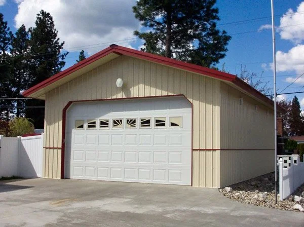 2 Car Garage With Wood Shop Color Band Detail 16×10 Overhead Door with Glasspanel 2 foot softed eaves. Building has Ivory siding with red color band, trim and roofing.